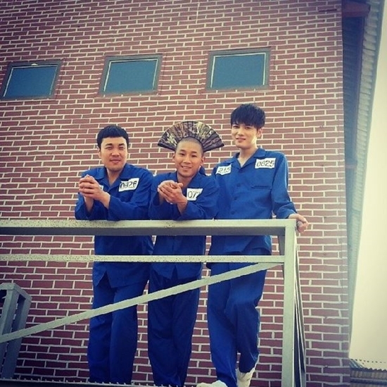 가수 쇼리가 김재중, 신승환과 함께 파란 죄수복을 입고 찍은 사진을 공개했다.