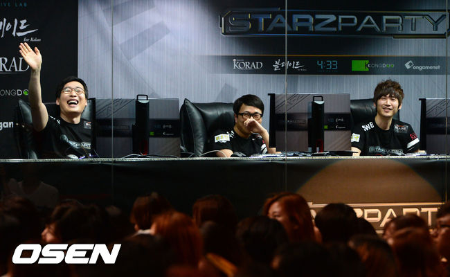9일 서울 용산 스포츠 온게임넷 상설경기장에서 진행된 '콩두스타즈파티', 3 VS 3 팀플 경기에서 승리한 강민-조용호-나도현 팀이 미소 짓고 있다