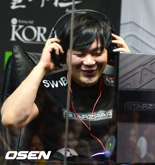 9일 서울 용산 스포츠 온게임넷 상설경기장에서 진행된 '콩두스타즈파티', 3 VS 3 팀플 경기에서 변길섭이 패한 후 미소 짓고 있다.