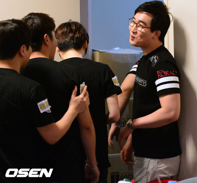 9일 서울 용산 스포츠 온게임넷 상설경기장에서 진행된 '콩두스타즈파티', 7세트 홍진호와 강민의 경기, 패한 강민이 홍진호에게 투정을 부리고 있다.