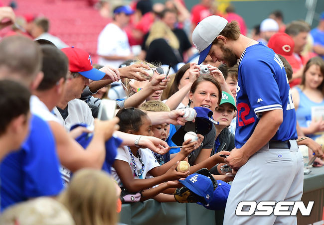 10일 오전(이하 한국시간) 미국 오하이오주 신시내티 그레이트 아메리칸 볼파크에서 열리는 '2014 메이저리그' 신시내티 레즈와 LA 다저스의 경기에 앞서 훈련을 마치고 더그아웃으로 들어오던 LA 다저스 커쇼가 팬들에게 사인을 해주고 있다.