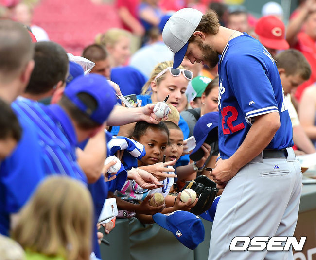 10일 오전(이하 한국시간) 미국 오하이오주 신시내티 그레이트 아메리칸 볼파크에서 열리는 '2014 메이저리그' 신시내티 레즈와 LA 다저스의 경기에 앞서 훈련을 마치고 더그아웃으로 들어오던 LA 다저스 커쇼가 팬들에게 사인을 해주고 있다.