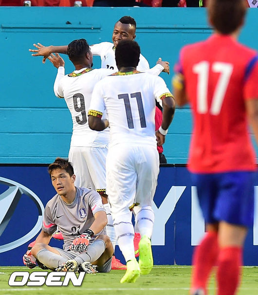 한국은 이른 시간 선제골을 허용했다. 김창수가 한국 진영에서 치명적인 백패스 실수로 아사모아 기안에게 볼을 차단 당했고, 전반 10분 조던 아예유에게 선제골을 내줬다.