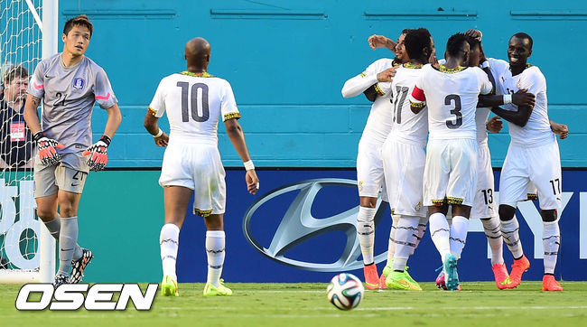 중원에서 힘을 내지 못한 한국은 전반 10분 선제골을 허용했다. 김창수(가시와 레이솔)의 어설픈 백패스를 가나의 아사모아 기안(알 아인)이 차단하며 문전으로 짧게 내줬다. 기안의 패스를 받은 아예우는 반대편으로 크로스를 연결했고 조던 아예우가 시도한 오른발 슈팅이 기성용 몸 맞고 굴절되며 한국의 골네트를 흔들었다.