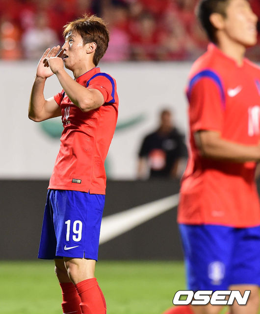 10일(이하 한국시간) 미국 마이애미에 위치한 선라이프 스타디움에서 열린 한국과 가나의 평가전, 후반 김보경이 슛 찬스를 놓친후 아쉬워하고 있다.