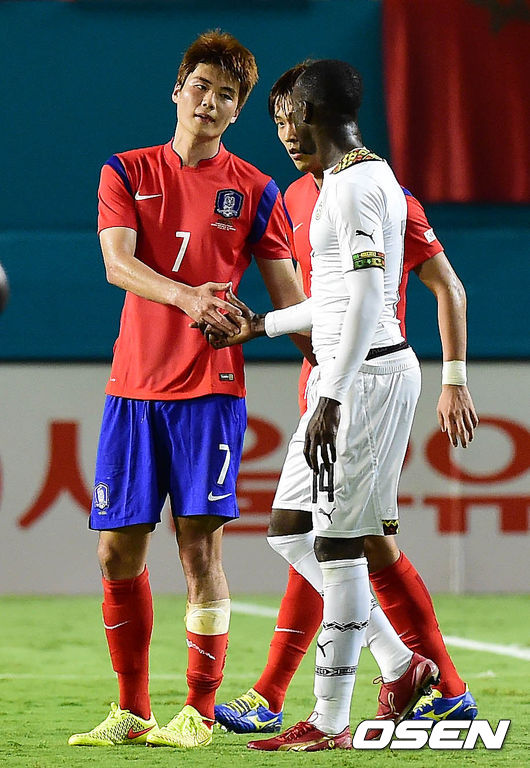 경기 종료 후 기성용이 알버트 아도마와 악수를 나누고 있다.