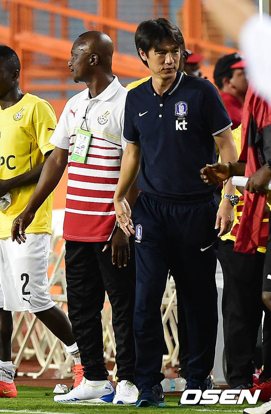 경기 종료 후 홍명보 감독이 가나 감독(왼쪽)과 인사를 나누고 벤치로 돌아가고 있다.
