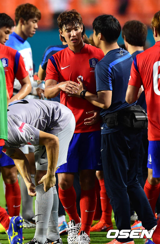 경기 종료 후 홍정호가 대표팀 스텝의 격려를 받고 있다.