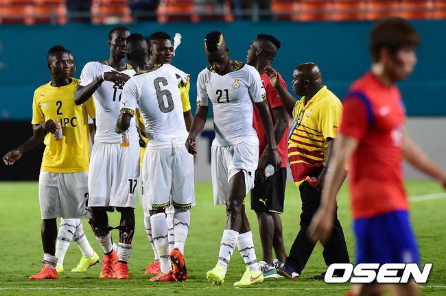 경기 종료 후 가나 대표팀 선수들이 기쁨을 나누며 경기장을 빠져나가고 있다.
