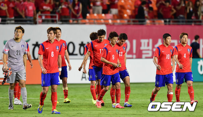 경기 종료 후 한국 축구대표팀 선수들이 고개를 숙인 채 경기장을 빠져나가고 있다.