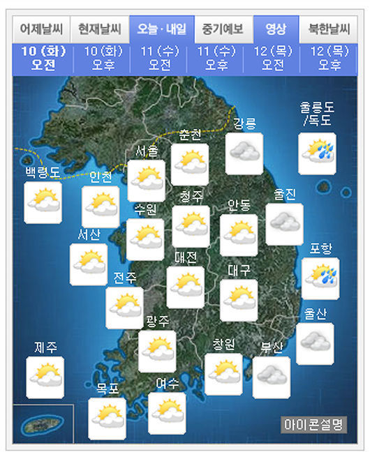 전국이 가끔 구름많겠고, 아침까지 경북 일부지역에는 소나기(강수확률 60%)가 오는 곳이 있겠고, 낮부터 늦은 밤 사이에는 강원동해안을 제외한 대부분 지역에서 산발적으로 소나기(강수확률 60~70%)가 오는 곳이 많겠습니다. 제주도는 밤부터 내일(11일) 새벽 사이에 동풍의 영향으로 비(강수확률 60%)가 조금 오는 곳이 있겠습니다.