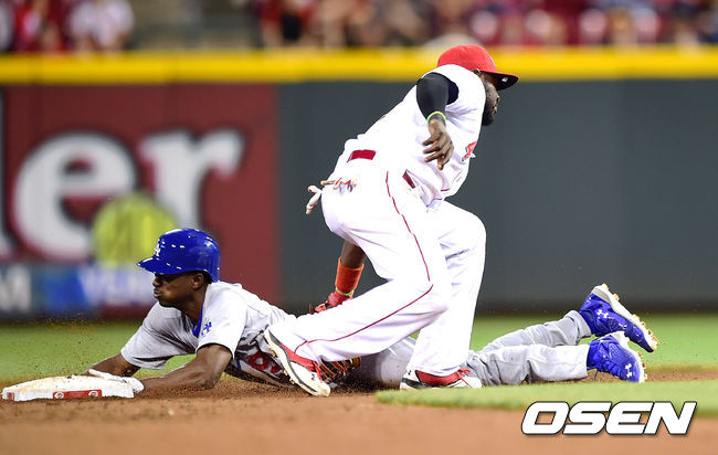 9회초 무사 LA 다저스 디 고든이 2루 도루를 시도하다 아웃당하고 있다.
