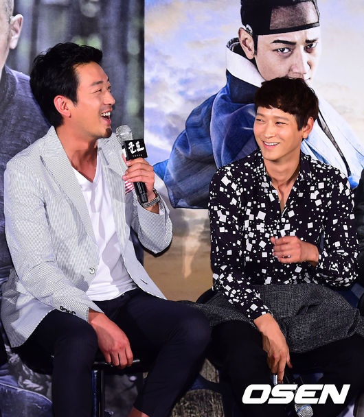 10일 오전 서울 코엑스 메가박스에서 진행된 영화 '군도:민란의 시대(이하 '군도')' 제작발표회에서 하정우의 답변에 강동원이 미소짓고 있다.