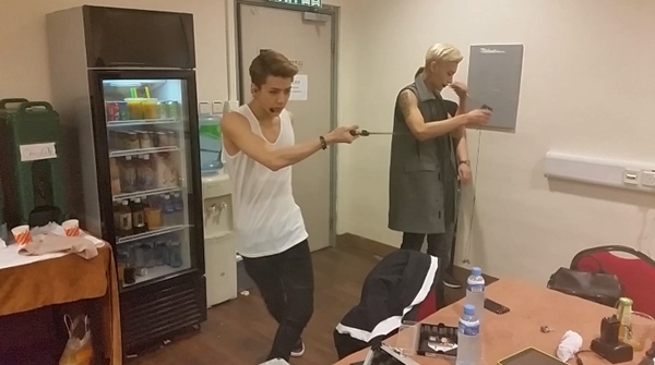 첸을 뭘 하나 살펴볼까요? 카메라가 자신을 향하자 첸은 환하게 미소 지으며 반겨주네요. 첸은 에너지 드링크를 마시며 힘을 충전하고 있네요. 멋있는 무대를 위해서는 역시 체력이 중요하겠죠. 반면 세훈은 대기실에서 칼을 들고 무술 연습을 하고 있습니다. 평소 타오가 하던 무술이 하고 싶었던 걸까요? 검을 들고 허공을 가르는 모습이 시선을 사로잡네요. 타오는 옆에서 마이크를 확인하고 있고요.