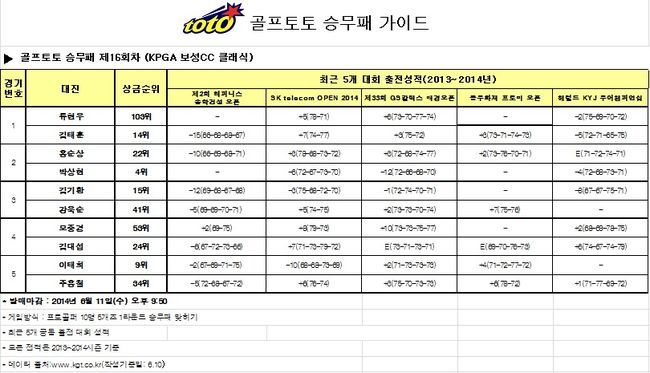 국민체육진흥공단(www.kspo.or.kr)이 발행하는 체육진흥투표권 수탁사업자인 스포츠토토 공식 온라인 발매 사이트인 베트맨(www.betman.co.kr)은 오는 12일에 보성CC에서 열리는 'KPGA 보성CC 클래식' 1라운드를 대상으로 한 골프토토 승무패 16회차에서 전체 참가자의 54.39%가 1번 매치에서 류현우가 김태훈보다 적은 타수를 선보일 것으로 예상했다고 밝혔다.