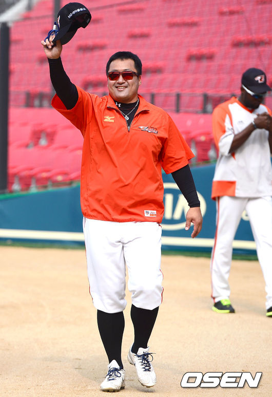 10일 광주-기아챔피언스필드에서 열린 2014 한국야쿠르트 세븐 프로야구 KIA 타이거즈와 한화 이글스의 경기에 앞서 한화 조인성이 담당 기자를 향해 손을 흔들고 있다.