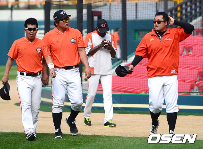 10일 광주-기아챔피언스필드에서 열린 2014 한국야쿠르트 세븐 프로야구 KIA 타이거즈와 한화 이글스의 경기에 앞서 스트레칭을 마친 한화 조인성과 정근우, 김태균이 이야기를 나누며 더그아웃으로 들어가고 있다.