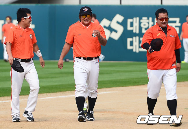 10일 광주-기아챔피언스필드에서 열린 2014 한국야쿠르트 세븐 프로야구 KIA 타이거즈와 한화 이글스의 경기에 앞서 스트레칭을 마친 한화 정근우와 김태균, 조인성이 이야기를 나누며 더그아웃으로 들어가고 있다.