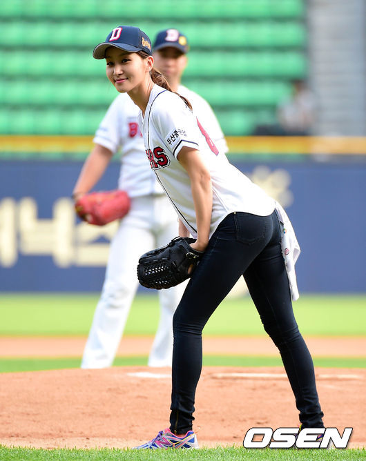 경기에 앞서 배우 김정민이 시구를 하고 있다.