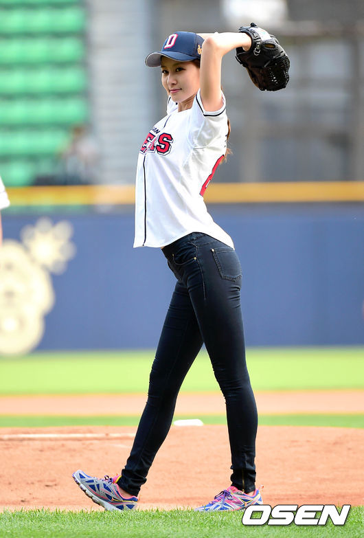 경기에 앞서 배우 김정민이 시구를 하고 있다.