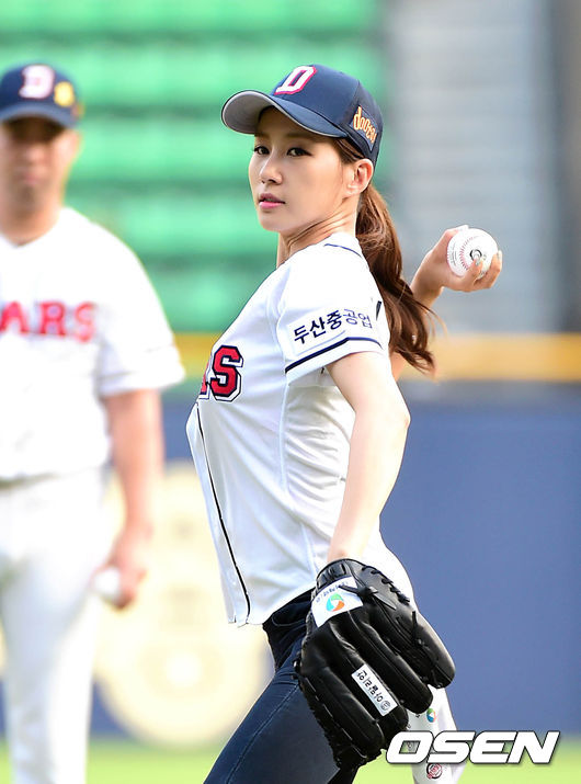 경기에 앞서 배우 김정민이 시구를 하고 있다.