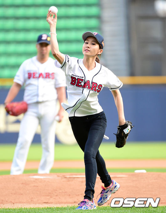 경기에 앞서 배우 김정민이 시구를 하고 있다.