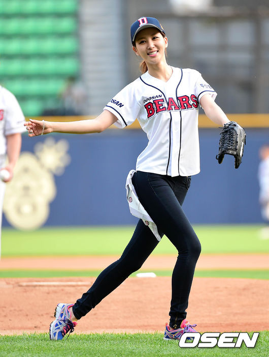 경기에 앞서 배우 김정민이 시구를 하고 있다.