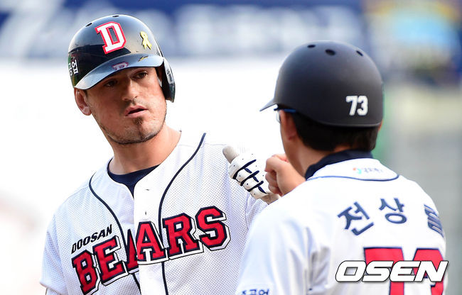 1회말 무사 만루에서 두산 칸투가 좌전 적시타를 치고 전상렬 코치와 하이파이브를 하고 있다.