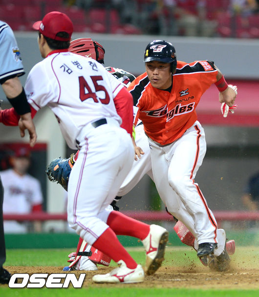 10일 광주-기아챔피언스필드에서 열린 2014 한국야쿠르트 세븐 프로야구 KIA 타이거즈와 한화 이글스의 경기, 3회초 2사 만루 한화 최진행의 2타점 적시타때 2루 주자 정근우가 홈쇄도해 세이프되고 있다.