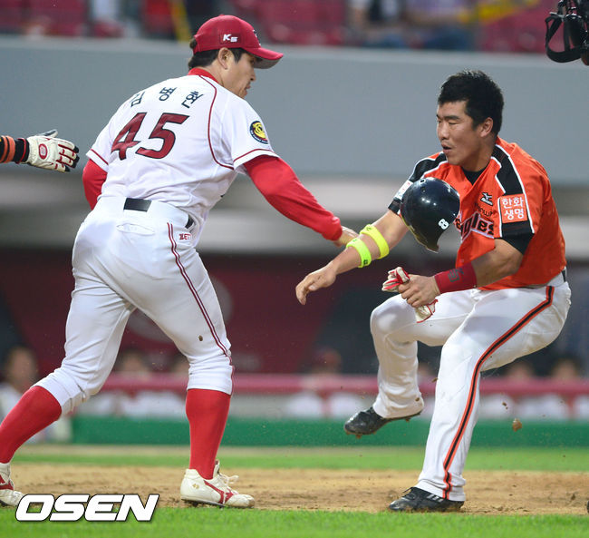 10일 광주-기아챔피언스필드에서 열린 2014 한국야쿠르트 세븐 프로야구 KIA 타이거즈와 한화 이글스의 경기, 3회초 2사 만루 한화 최진행의 2타점 적시타때 2루 주자 정근우가 홈쇄도해 김병현과 충돌하고 있다. 정근우는 세이프로 득점 성공.