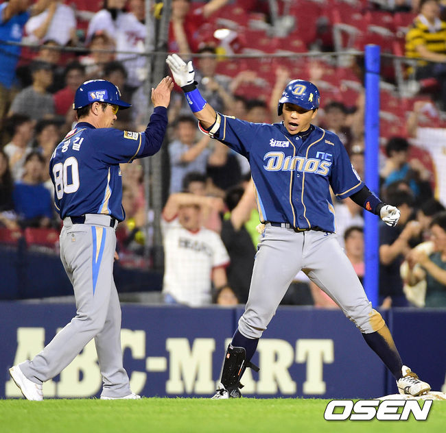 4회초 무사 만루에서 NC 이종욱이 우중간을 가르는 역전 3타점 3루타를 치고 환호하고 있다.