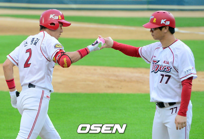 10일 광주-기아챔피언스필드에서 열린 2014 한국야쿠르트 세븐 프로야구 KIA 타이거즈와 한화 이글스의 경기, 1회말 2사 KIA 신종길이 동점 솔로홈런을 날리고 김종국 코치와 하이파이브를 하고 있다.