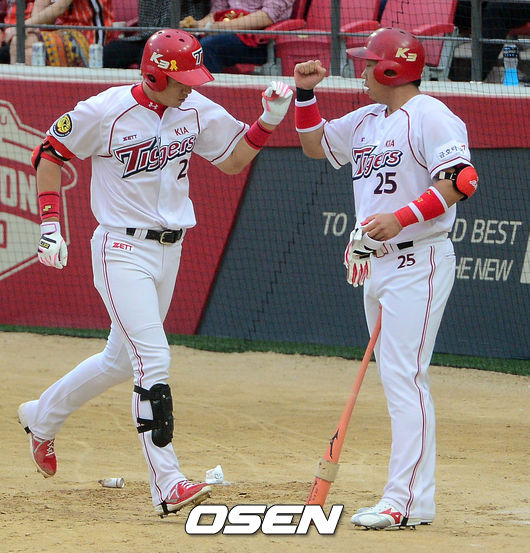 10일 광주-기아챔피언스필드에서 열린 2014 한국야쿠르트 세븐 프로야구 KIA 타이거즈와 한화 이글스의 경기, 1회말 2사 KIA 신종길이 동점 솔로홈런을 날리고 이범호와 하이파이브를 하고 있다.