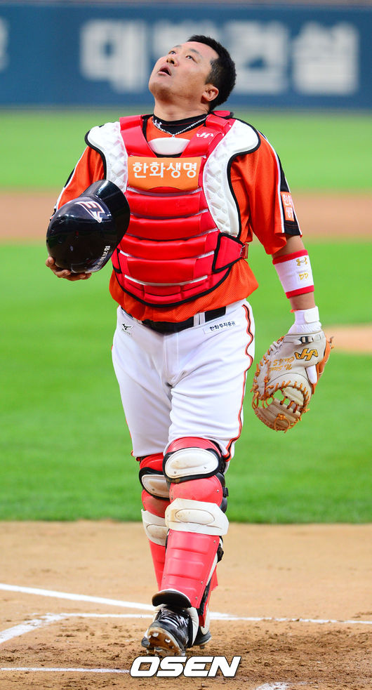 10일 광주-기아챔피언스필드에서 열린 2014 한국야쿠르트 세븐 프로야구 KIA 타이거즈와 한화 이글스의 경기, 1회말 한화로 이적된 조인성이 선발 출장하며 포스 마스크를 쓰고 있다.