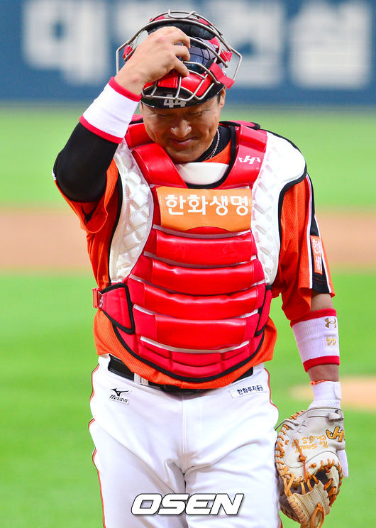10일 광주-기아챔피언스필드에서 열린 2014 한국야쿠르트 세븐 프로야구 KIA 타이거즈와 한화 이글스의 경기, 1회말 한화로 이적된 조인성이 선발 출장하며 포스 마스크를 쓰고 있다.