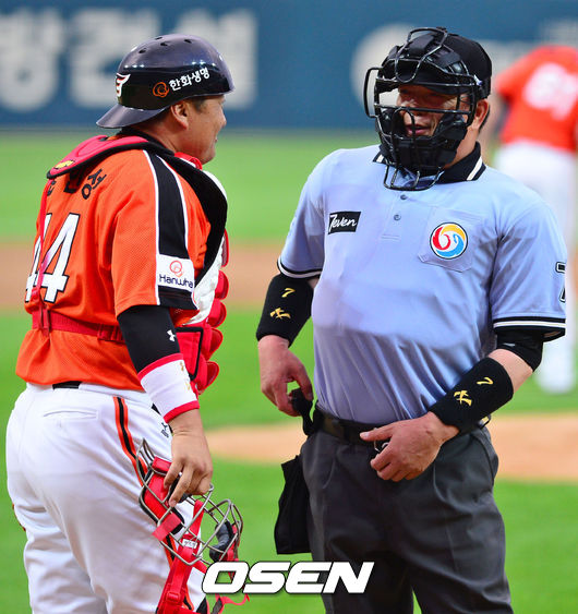10일 광주-기아챔피언스필드에서 열린 2014 한국야쿠르트 세븐 프로야구 KIA 타이거즈와 한화 이글스의 경기, 1회말 한화로 이적된 조인성이 선발 출장하며 문승훈 구심과 이야기를 나누고 있다.