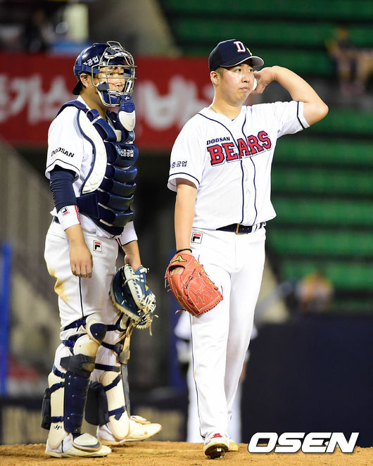 4회초 무사 1,2루 두산 유희관이 마운드를 내려가고 있다.