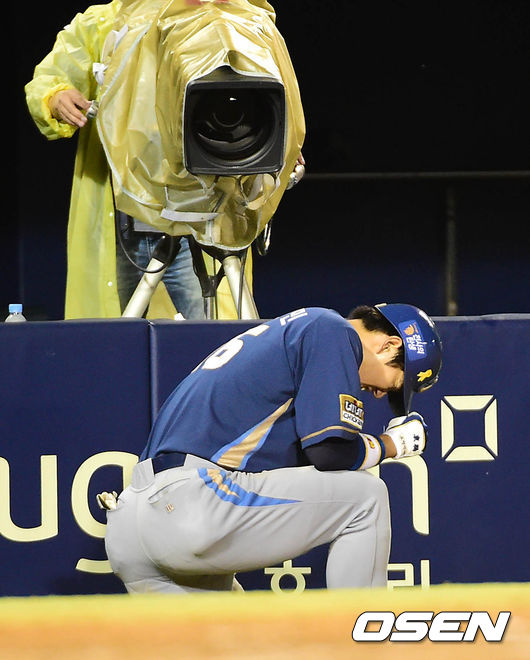 9회초 무사에서 NC 모창민이 중월 솔로 홈런을 치고 티보잉 세레모니를 하고 있다.