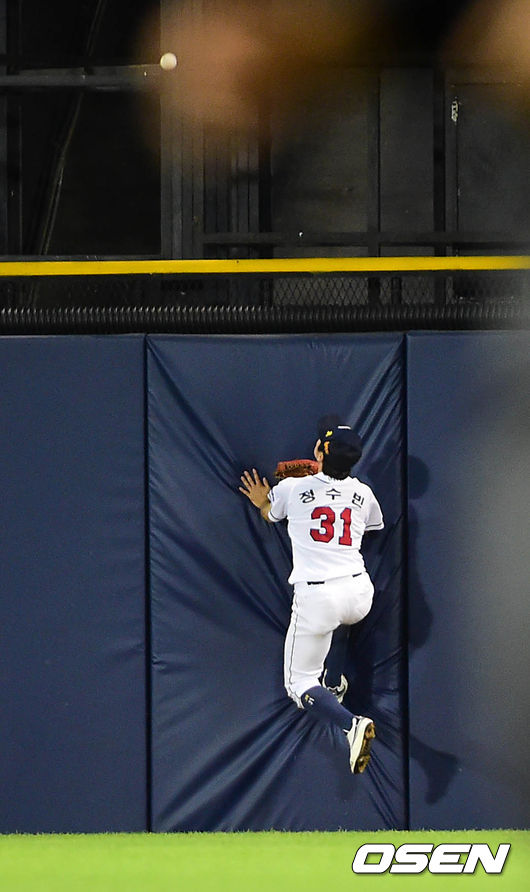 9회초 무사에서 두산 정수빈이 담장을 넘어가는 NC 모창민의 홈런 타구를 바라보고 있다.