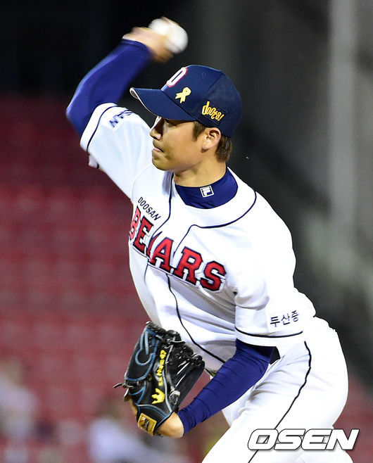 9회초 두산 홍상삼이 힘차게 공을 던지고 있다.
