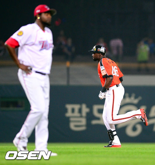 10일 광주-기아챔피언스필드에서 열린 2014 한국야쿠르트 세븐 프로야구 KIA 타이거즈와 한화 이글스의 경기, 8회초 2사 1루 한화 피에가 동점 2점 홈런을 날리고 베이스를 돌고 있다.