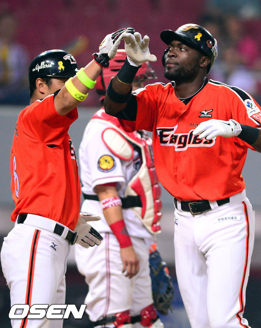 10일 광주-기아챔피언스필드에서 열린 2014 한국야쿠르트 세븐 프로야구 KIA 타이거즈와 한화 이글스의 경기, 8회초 2사 1루 한화 피에가 동점 2점 홈런을 날리고 정근우와 하이파이브를 하고 있다