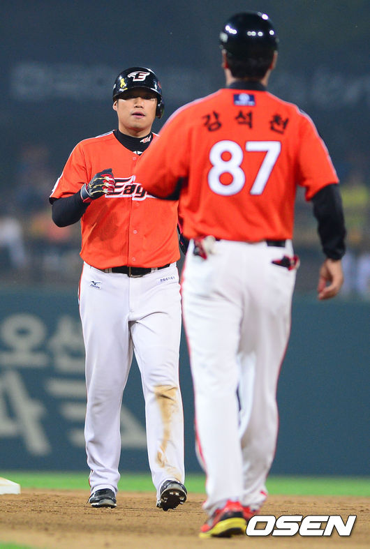 10일 광주-기아챔피언스필드에서 열린 2014 한국야쿠르트 세븐 프로야구 KIA 타이거즈와 한화 이글스의 경기, 8회초 2사 2루 한화 최진행이 역전 1타점 2루타를 날리고 강석천 코치와 하이파이브를 하고 있다.