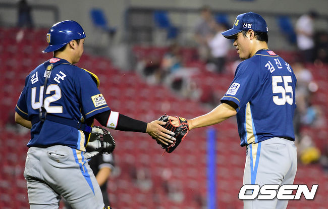 경기 종료 후 NC 김태군과 김진성이 승리의 기쁨을 나누고 있다./sunday@osen.co.kr