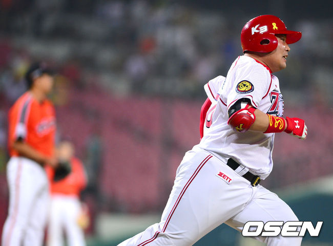 10일 광주-기아챔피언스필드에서 열린 2014 한국야쿠르트 세븐 프로야구 KIA 타이거즈와 한화 이글스의 경기, 8회말 1사 2루 KIA 대타 이종환이 역전 2점 홈런을 날리고 베이스를 돌고 있다.