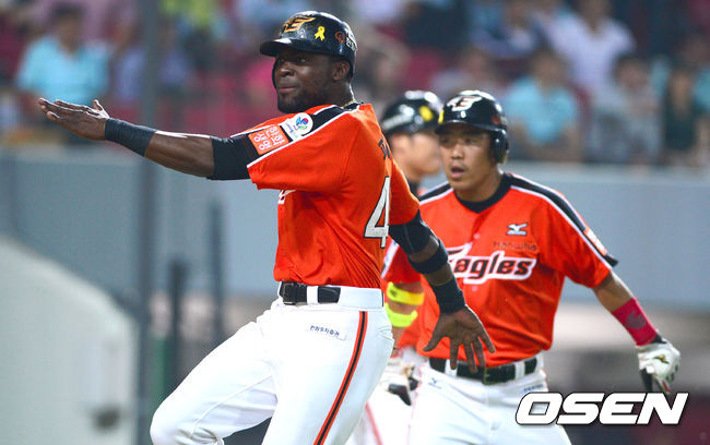 10일 광주-기아챔피언스필드에서 열린 2014 한국야쿠르트 세븐 프로야구 KIA 타이거즈와 한화 이글스의 경기,9회초 2사 1,3루 한화 송광민의 역전 2타점 적시타때 1루 주자 피에가 홈을 밟은뒤 미소 짓고 있다
