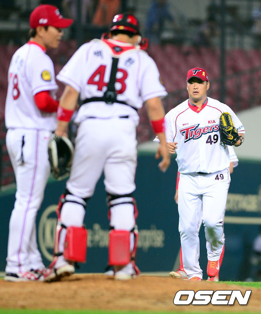 10일 광주-기아챔피언스필드에서 열린 2014 한국야쿠르트 세븐 프로야구 KIA 타이거즈와 한화 이글스의 경기,9회초 KIA 김진우가 교체되어 마운드에 오르고 있다.