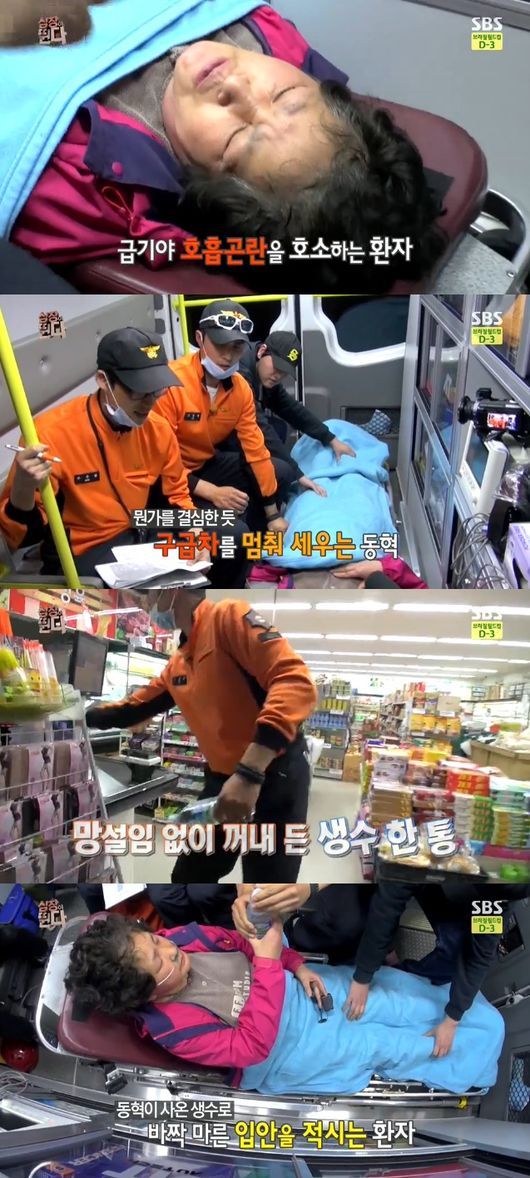병원까지 먼 거리를 가야된다는 사실에 조동혁은 뭔가를 결심한 듯 구급차를 편의점 앞에 세우고 들어가더니 물 한 병을 사서 환자에게 건넸다.