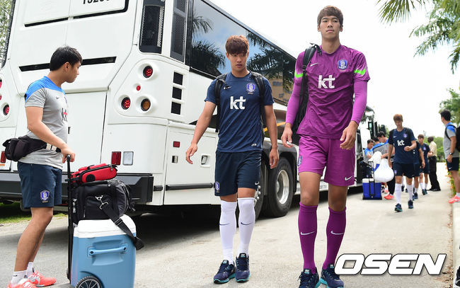10일 밤(이하 한국시간) 미국 플로리다주 마이애미 세인트 토마스 대학에서 열린 대표팀 회복훈련에 홍정호와 이범영이 도착해 그라운드로 향하고 있다.