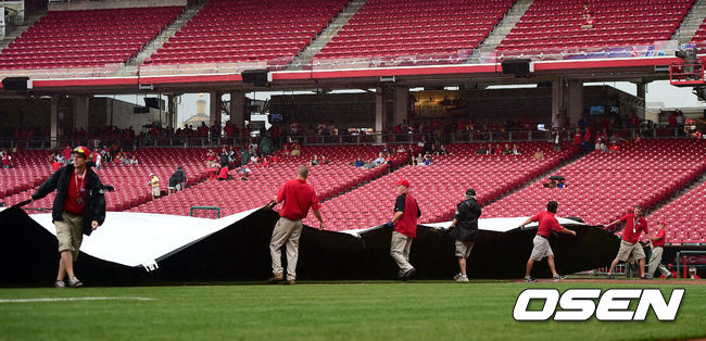 11일 오전(이하 한국시간) 미국 오하이오주 신시내티 그레이트 아메리칸 볼파크에서 열리는 '2014 메이저리그' 신시내티 레즈와 LA 다저스의 경기에 앞서 갑작스럽게 내린 비로 구장 관계자들이 그라운드에 방수포를 덮고 있다.